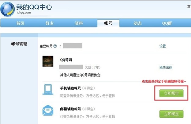 2、点击“立即绑定”手机辅助帐号(或邮箱辅助帐号)。