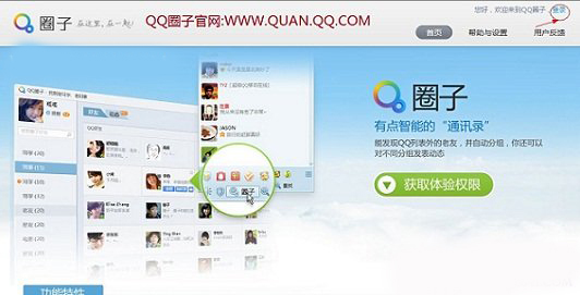 3、另外再告诉大家一种通用的进入QQ圈子的方法,如果你不是QQ2013版本或者QQ2012里找不到QQ圈子在哪怎么办?没关系,我们还可以进入QQ圈子官网,之后即可打开QQ圈子了,方法是打开QQ圈子官网:quan.qq.com,然后登录即可进入QQ圈子了,如下图: