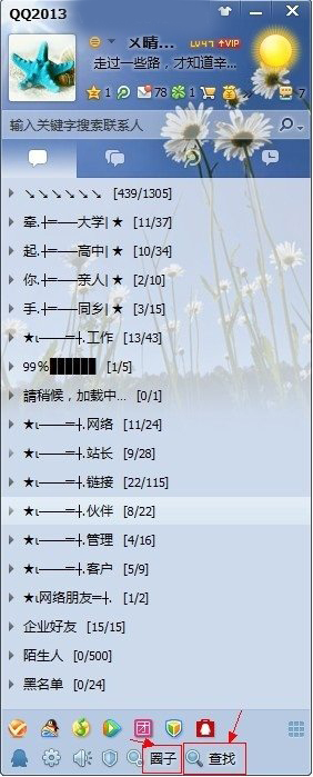 1、如果电脑上安装的是最新的QQ2013的话,我们直接可以再QQ面板底部找到QQ圈子,如下图: