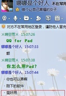 7.截止2013年1月QQ for Pad升级到1.5版本,支持“视频通话”这一重量级功能,真正实现了“想你时你在眼前”,设备上支持在电脑上、平板电脑、安卓手机、苹果iPad平板电脑等诸多设备上使用,详情请访问QQ for Pad官网(http://im.qq.com/pad/)。