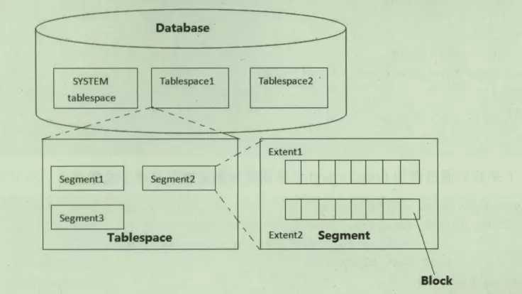 逻辑存储结构是Oracle数据库存储结构的核心内容,对Oracle的所有操作都会涉及逻辑存储结构。逻辑存储结构是从逻辑的角度分析数据库的构成,是对数据库存储结构在逻辑概念上的划分。Oracle数据库(Database)从逻辑存储结构上讲,主要包括表空间(Tablespace)、段(Segment)、区(Extent)和数据块(Block)。这四者存在关系为:多个数据块组成一个区;多区组成一个段;多个段组成一个表空间。一个Oracle数据库(数据库本身也属于逻辑结构)由多个表空间组成,Oracle数据库的逻辑存储结构可以表示为下图: