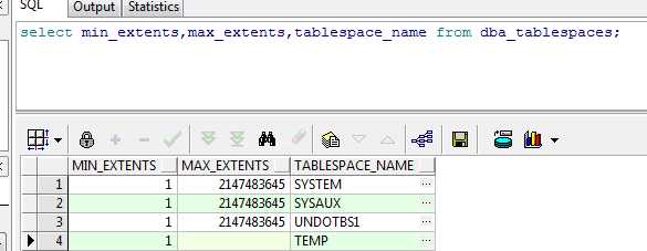 select min_extents,max_extents,tablespace_name from dba_tablespaces;