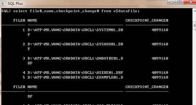 上述图7可以看出,FILE#为数据文件编号;NAME为数据文件名称;CHECKPOINT_CHANGE#为数据文件的同步号,同步号随着系统的运行自动修改,以维持所有数据文件的同步。
