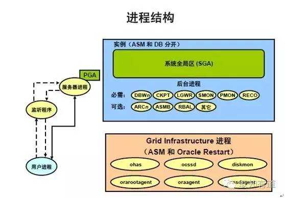 系统全局区(System Global Area,SGA)与Oracle进程组合成为Oracle数据库实例。其中,SGA是由Oracle为一个实例分配的一组共享内存区域,而Oracle进程则在系统启动后异步地为所有数据库用户执行不同的任务。