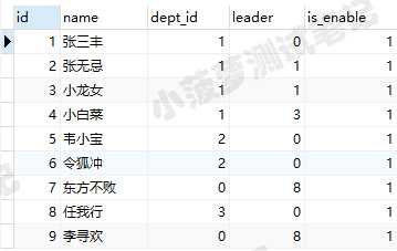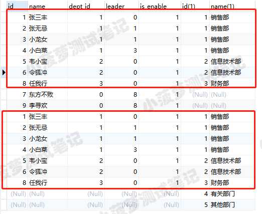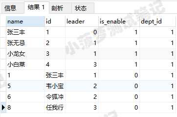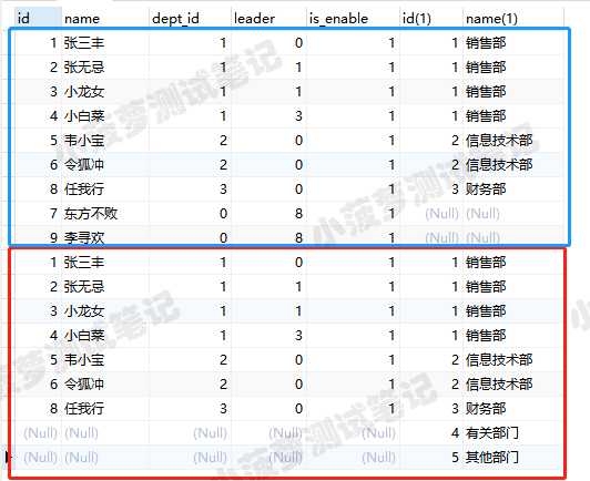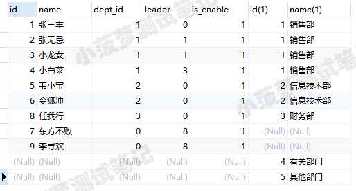 select * from emp where dept_id = 1unionselect id,name,dept_id,leader,is_enable from emp where leader = 0