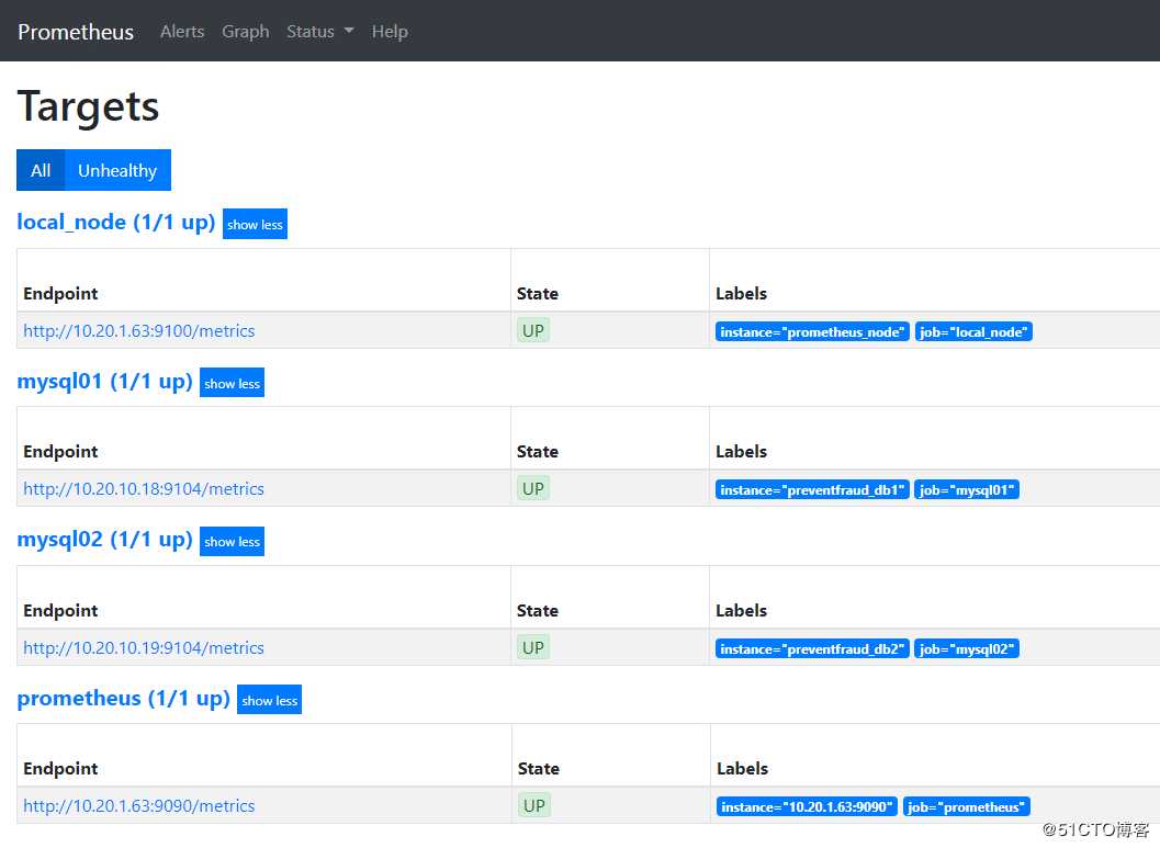 scrape_configs:# The job name is added as a label `job=<job_name>` to any timeseries scraped from this config.- job_name: ‘prometheus‘# metrics_path defaults to ‘/metrics‘# scheme defaults to ‘http‘.static_configs:- targets: [‘10.20.1.63:9090‘]- job_name: ‘local_node‘static_configs: - targets: [‘10.20.1.63:9100‘] labels: instance: prometheus_node- job_name: ‘mysql01‘static_configs: - targets: [‘10.20.10.18:9104‘] labels: instance: db1- job_name: ‘mysql02‘static_configs: - targets: [‘10.20.10.19:9104‘] labels: instance: db2wget https://github.com/prometheus/node_exporter/releases/download/v0.18.1/node_exporter-0.18.1.linux-amd64.tar.gzmkdir -p /opt/prometheustar xzvf node_exporter-0.18.1.linux-amd64.tar.gz mv node_exporter-0.18.1.linux-amd64 /opt/prometheus/ln -s /opt/prometheus/node_exporter-0.18.1.linux-amd64/ /opt/prometheus/node_exporter添加系统服务启动.