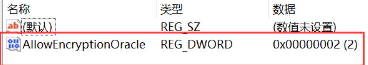 然后再最底部Parameters项里面 新建 DWORD(32)位的,名称为 “AllowEncryptionOracle” ,值 : 2。