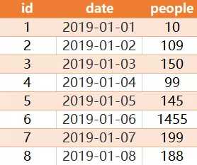 sys@WIL> WITH T AS 2 (SELECT 1 ID, DATE ‘2019-01-01‘ DT, 10 PEOPLE 3 FROM DUAL 4 UNION ALL 5 SELECT 2 ID, DATE ‘2019-01-02‘ DT, 109 PEOPLE 6 FROM DUAL 7 UNION ALL 8 SELECT 3 ID, DATE ‘2019-01-03‘ DT, 150 PEOPLE 9 FROM DUAL 10 UNION ALL 11 SELECT 4 ID, DATE ‘2019-01-04‘ DT, 99 PEOPLE 12 FROM DUAL 13 UNION ALL 14 SELECT 5 ID, DATE ‘2019-01-05‘ DT, 145 PEOPLE 15 FROM DUAL 16 UNION ALL 17 SELECT 6 ID, DATE ‘2019-01-06‘ DT, 1455 PEOPLE 18 FROM DUAL 19 UNION ALL 20 SELECT 7 ID, DATE ‘2019-01-07‘ DT, 199 PEOPLE 21 FROM DUAL 22 UNION ALL 23 SELECT 8 ID, DATE ‘2019-01-08‘ DT, 188 PEOPLE 24 FROM DUAL) 25 SELECT ID, DT, PEOPLE 26 FROM (SELECT TT.*, COUNT(*) OVER(PARTITION BY GID) CN 27 FROM (SELECT T.*, ID - ROW_NUMBER() OVER(ORDER BY DT) GID 28 FROM T 29 WHERE PEOPLE > 100) TT) 30 WHERE CN >= 3 31 ORDER BY 2; ID DT PEOPLE---------- ---------- ---------- 5 2019-01-05 145 6 2019-01-06 1455 7 2019-01-07 199 8 2019-01-08 188