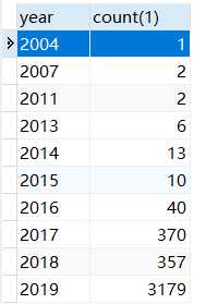 date_format(application_date, ‘%Y‘),可自定义日期格式SELECT date_format(application_date, "%Y") as year, count(1) FROM patent GROUP BY date_format(application_date, "%Y")