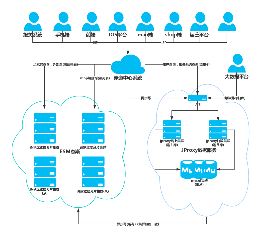 | coding | es分别按照商家id分片,保税区id分片,异步写,读开放jsf | 2套集群4套索引 | es | 中 |