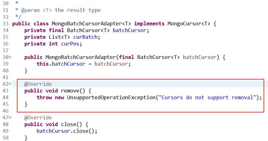 MongoBatchCursorAdapter中的remove方法抛出的异常,我们进入到该类,查看其remove方法,