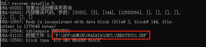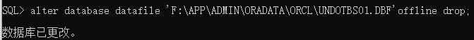 第五步:输入命令:alter database datafile ‘F:\APP\ADMIN\ORADATA\ORCL\UNDOTBS01.DBF‘offline drop;