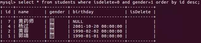 select * from 表名 order by 列1 asc或desc,列2 asc或desc,...select * from students where gender=1 and isdelete=0 order by id desc;