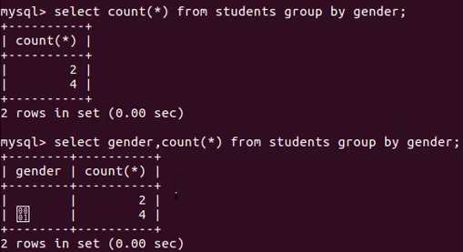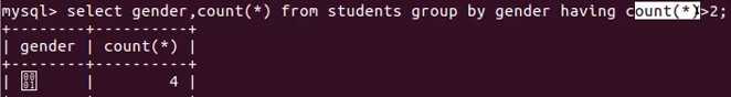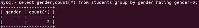 select count(*) from students where gender=1;----------------------------------- 方案二: select gender as 性别,count(*) from students group by gender having gender=1;