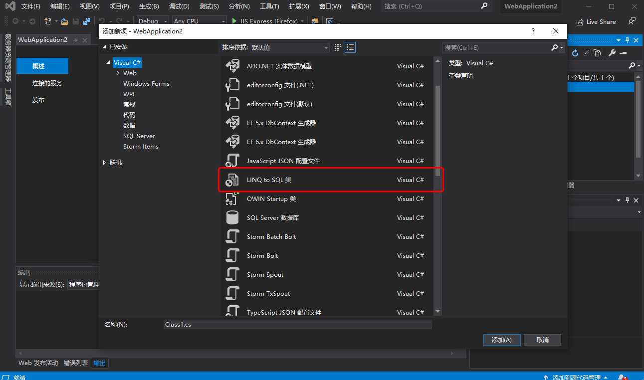 这里注意如果没这个包(LINQ to SQL 类)的话,那就是你安装vs的时候没有安装需要去修改找到这个文件安装一下