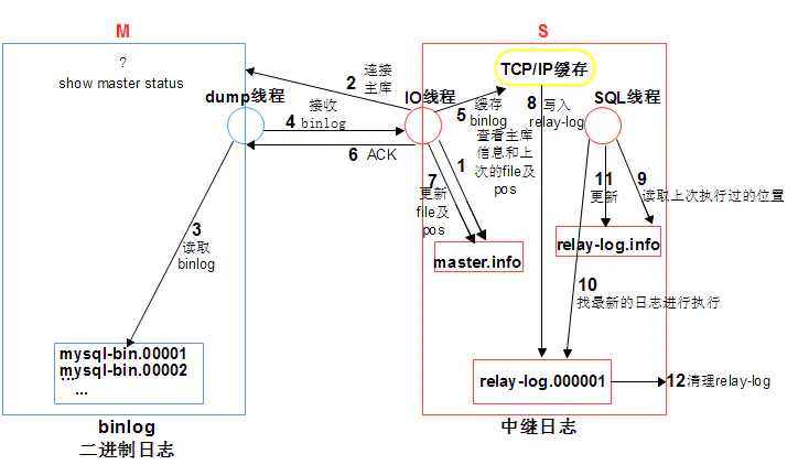 1.change master to 时,ip pot user password binlog position写入到master.info进行记录2. start slave 时,从库会启动IO线程和SQL线程3.IO_T,读取master.info信息,获取主库信息连接主库4. 主库会生成一个准备binlog DUMP线程,来响应从库5. IO_T根据master.info记录的binlog文件名和position号,请求主库DUMP最新日志6. DUMP线程检查主库的binlog日志,如果有新的,TP(传送)给从从库的IO_T7. IO_T将收到的日志存储到了TCP/IP 缓存,立即返回ACK给主库 ,主库工作完成8.IO_T将缓存中的数据,存储到relay-log日志文件,更新master.info文件binlog 文件名和postion,IO_T工作完成9.SQL_T读取relay-log.info文件,获取到上次执行到的relay-log的位置,作为起点,回放relay-log10.SQL_T回放完成之后,会更新relay-log.info文件。11. relay-log会有自动清理的功能。细节:1.主库一旦有新的日志生成,会发送“信号”给binlog dump ,IO线程再请求