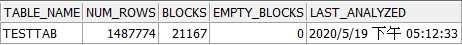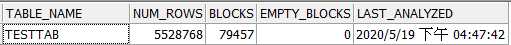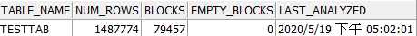 SELECT TABLE_NAME, NUM_ROWS, BLOCKS, empty_blocks, LAST_ANALYZED FROM dba_tables where owner=‘SYS‘ and table_name=‘TESTTAB‘;