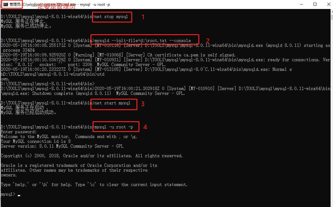 mysqld --init-file=D:\TOOLS\mysql\mysql-8.0.11-winx64\root.txt --console