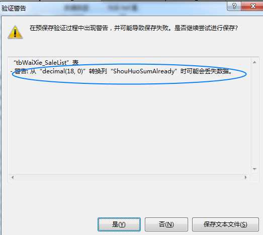 如:要是里面的数据有一个是 11.56 那么要是在数据库中将这个字段的类型变成decimal(18, 0) 时,就变成12,这个会四舍五入的,改变后在变成decimal(18, 2) 类型时,会提示你可能会出现精度丢失,在查看时变成了 12.00 ,果然丢失,nice,所以要注意