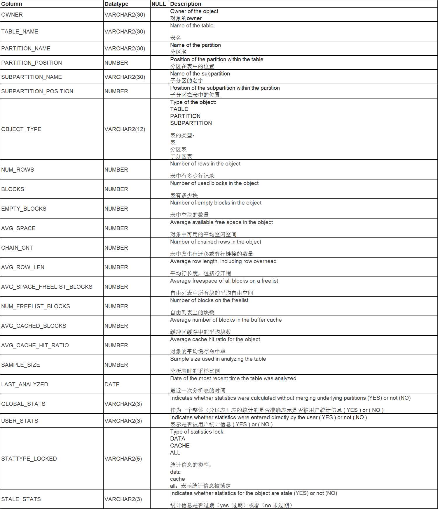 DBA_TAB_STATISTICS显示数据库中所有表的优化器统计信息。它的列与ALL_TAB_STATISTICS中的列相同。ALL_TAB_STATISTICS显示当前用户可以访问的表的优化器统计信息。USER_TAB_STATISTICS显示当前用户拥有的表的优化器统计信息。此视图不显示所有者列。