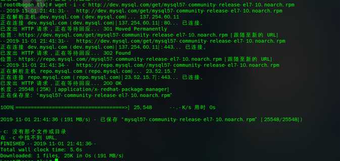 [root@localhost ~]# wget -i -c http://dev.mysql.com/get/mysql57-community-release-el7-10.noarch.rpm