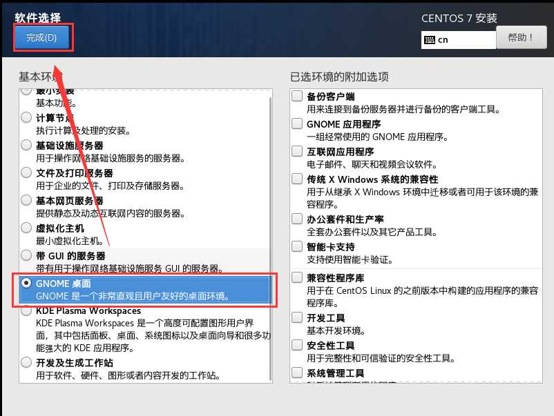 选择安装的软件,左边点上图形桌面,不然安装后只有命令行,这里选择的是GNOME Desktop。