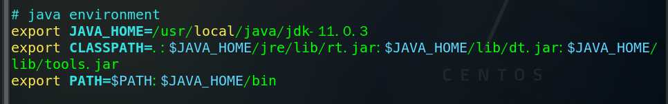 # 编辑 /etc/profilevim /etc/profile# 最后一行插入以下内容# java environmentexport JAVA_HOME=/usr/local/java/jdk-11.0.3export CLASSPATH=.:$JAVA_HOME/jre/lib/rt.jar:$JAVA_HOME/lib/dt.jar:$JAVA_HOME/lib/tools.jarexport PATH=$PATH:$JAVA_HOME/bin