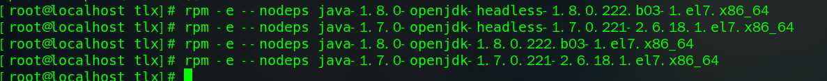 su rootrpm -e --nodeps java-1.8.0-openjdk-headless-1.8.0.222.b03-1.el7.x86_64rpm -e --nodeps java-1.7.0-openjdk-headless-1.7.0.221-2.6.18.1.el7.x86_64rpm -e --nodeps java-1.8.0-openjdk-1.8.0.222.b03-1.el7.x86_64rpm -e --nodeps java-1.7.0-openjdk-1.7.0.221-2.6.18.1.el7.x86_64