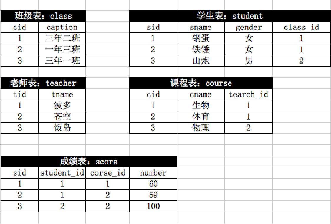 1、自行创建测试数据2、查询“生物”课程比“物理”课程成绩高的所有学生的学号;select A.student_id,sw,ty from (select student_id,number as sw from score left join course on score.corse_id = course.cid where course.cname = ‘生物‘) as A left join (select student_id,number as ty from score left join course on score.corse_id = course.cid where course.cname = ‘体育‘) as B on A.student_id = B.student_id where sw > if(isnull(ty),0,ty);3、查询平均成绩大于60分的同学的学号和平均成绩;思路:产寻学生的id,和成绩,然后用avg函数来求得同一id号的学生平均成绩,并用having进行成绩的筛选select student_id,avg(number) from score group by student_id having avg(number)>60;增加显示学生名select student_id,student.sname,avg(number) from score left join student on score.student_id=student.sid group by student_id having avg(number)>60;第二种实现方式个人觉得这种方式好理解一些,语法结构是先通过select student_id,avg(number) as stu_num from score group by student_id语句分组将数据取出并起临时表别名为SCORE,然后在和student表进行连表。select SCORE.student_id,SCORE.stu_num from (select student_id,avg(number) as stu_num from score group by student_id) as SCORE left join student on SCORE.student_id=student.sid;4、查询所有同学的学号、姓名、选课数、总成绩;语句进化过程:(1)先讲student表关联起来,关联条件是student_idselect * from score left join student on score.student_id = student.sid;(2)再通过条件筛选自己需要显示的内容,用limit来分页显示select score.student_id,student.sname,score.corse_id,score.number from score left join student on score.student_id = student.sid limit 5;(3)用聚合函数count来统计课程数,用sum来算成绩的合。select score.student_id,student.sname,count(score.corse_id),sum(score.number) from score left join student on score.student_id = student.sid group by score.student_id limit 5; 终极:select score.student_id,student.sname,count(score.corse_id),sum(score.number) from score left join student on score.student_id = student.sid group by score.student_id;5、查询姓“李”的老师的个数;select count(tname) from teacher where tname like "李%";6、查询没学过“叶平”老师课的同学的学号、姓名;(1)查出李平老师所受的课select cid from course left join teacher on course.teacher_id=teacher.tid where teacher.tname="李平老师";(2)查出选择李平老师讲课的学生select * from score where score.corse_id in (select cid from course left join teacher on course.teacher_id=teacher.tid where teacher.tname="李平老师")(3)排除选择李平老师讲课的学生select sid,sname from student where student.sid not in (select student_id from score where score.corse_id in (select cid from course left join teacher on course.teacher_id=teacher.tid where teacher.tname="李平老师"));7、查询学过“001”并且也学过编号“002”课程的同学的学号、姓名;(1)取出课程id是1和2的课程select * from score where corse_id=1 or corse_id=2;(2)通过student_id来进行分组根据having来过来选择两门的学生select NEW_C.student_id,count(NEW_C.corse_id) as NUM from (select student_id,corse_id from score where corse_id=1 or corse_id=2) as NEW_C group by NEW_C.student_id having NUM=2;(3)连表select A.id,student.sname from (select NEW_C.student_id as ID,count(NEW_C.corse_id) as NUM from (select student_id,corse_id from score where corse_id=1 or corse_id=2) as NEW_C group by NEW_C.student_id having NUM=2) as A left join student on A.ID=student.sid;8、查询学过“叶平”老师所教的所有课的同学的学号、姓名;(1)连表查询课程和老师,并过滤出李平老师select cid,cname,teacher.tname from course left join teacher on course.teacher_id=teacher.tid where teacher.tname=‘李平老师‘;(2)查出选择李平老师课程的学生idselect * from score where corse_id in (select cid from course left join teacher on course.teacher_id=teacher.tid where teacher.tname=‘李平老师‘) group by student_id;(3)关联学生表显示姓名select A.student_id,student.sname from (select score.student_id from score where score.corse_id in (select course.cid from course left join teacher on course.teacher_id=teacher.tid where teacher.tname=‘李平老师‘) group by student_id) as A left join student on A.student_id=student.sid;9、查询课程编号“002”的成绩比课程编号“001”课程低的所有同学的学号、姓名;select A.student_id,num_id1,num_id2 from (select student_id,number as num_id1 from score where corse_id=1) as A left join (select student_id,number as num_id2 from score where corse_id=2) as B on A.student_id = B.student_id where num_id1 > if(isnull(num_id2),0,num_id2);10、查询有课程成绩小于60分的同学的学号、姓名;select student.sid,student.sname from (select score.student_id from score where score.number <60 group by score.student_id) as A left join student on student.sid= A.student_id;11、查询没有学全所有课的同学的学号、姓名;select student.sid,student.sname from (select student_id,count(corse_id) as S_NUM from score group by student_id having S_NUM < (select count(cname) as C_NUM from course)) as A left join student on student.sid=A.student_id;12、查询至少有一门课与学号为“001”的同学所学相同的同学的学号和姓名;(1)查询学生所选课程是否在学生id为1的学生的课程里面select student_id from score where student_id !=1 and score.corse_id in(select corse_id from score where student_id = 1) group by student_id;(2)和学生表关联取出相关的ID和姓名select student.sid,student.sname from (select student_id from score where student_id !=1 and score.corse_id in(select corse_id from score where student_id = 1) group by student_id) as A left join student on A.student_id=student.sid;13、查询至少学过学号为“001”同