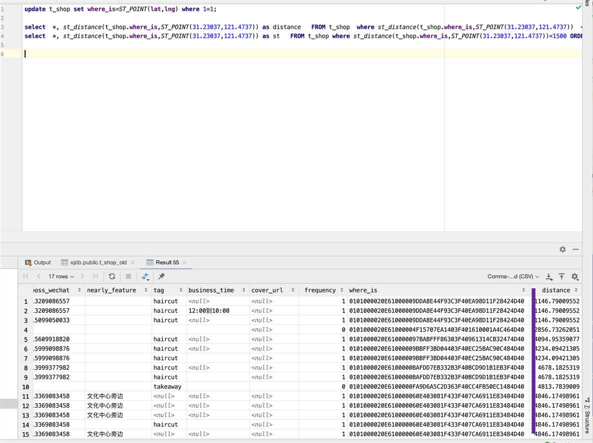 select *, st_distance(t_shop.where_is,ST_POINT(31.23037,121.4737)) as distance FROM t_shop where st_distance(t_shop.where_is,ST_POINT(31.23037,121.4737)) < 5000 ORDER BY distance;查询距离坐标点(31.23037,121.4737) 五公里的所有数据