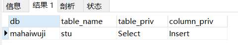 1 SELECT db,table_name,table_priv,column_priv 2 FROM mysql.tables_priv WHERE user = ‘test1‘;