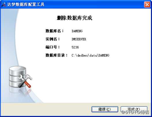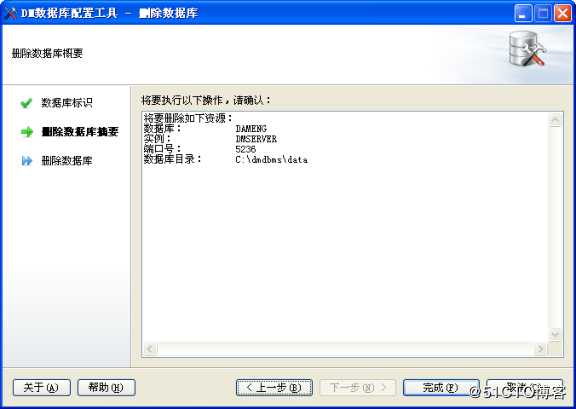 删除数据库,包括删除数据库的数据文件、日志文件、控制文件和初始化参数文件。为了保证删除数据库成功,必须保证 dmserver 已关闭。