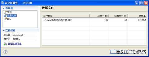 登录数据库管理工具,通过表空间属性,可以查看数据文件路径、总空间大小、空闲空间大小、使用率。如图所示。
