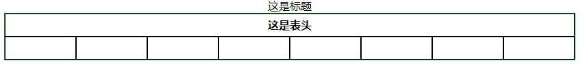 <table cellspacing="0"> <caption>这是标题</caption> <!--添加标题--> <tr> <th colspan="8">这是表头</th> <!--添加表头--> </tr> <tr> <td></td> <td></td> <td></td> <td></td> <td></td> <td></td> <td></td> <td></td> </tr> </table>