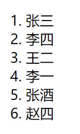 <ol> <!--有序列表--> <li>张三</li> <li>李四</li> <li>王二</li> <li>李一</li> <li>张酒</li> <li>赵四</li> </ol>