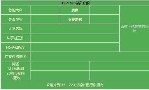 <!DOCTYPE html><html lang="en"><head> <meta charset="UTF-8"> <title>这是个标题</title> <style> table{ background-color: #51ad51; border: 1px solid white; } table tr td{ width: 200px; height: 60px; text-align: center; color: antiquewhite; } .gray{ color: #c9c9c9; } </style></head><body> <table border="1px" cellspacing="0"> <tr> <th colspan="8">H5-1725学员介绍</th> </tr> <col width="100px" /> <tr> <td>您的大名</td> <td colspan="2"></td> <td><strong>贵庚</strong></td> <td colspan="2"></td> <td rowspan="5" colspan="2" class="gray">请放下你最美的照片</td> </tr> <tr> <td>是否毕业</td> <td colspan="2"></td> <td><strong>专业是啥</strong></td> <td colspan="2"></td> </tr> <tr> <td>大学名称</td> <td colspan="5"></td> </tr> <tr> <td>从事过工作</td> <td colspan="5"></td> </tr> <tr> <td>H5基础程度</td> <td colspan="5"></td> </tr> <tr> <td>自我性格描述</td> <td colspan="7"></td> </tr> <tr> <td rowspan="2">简述<br>1.目标规划<br>2.对H5疑问<br>3.建议</td> <td colspan="3"></td> <td colspan="4"></td> </tr> <tr> <td colspan="3"></td> <td colspan="4"></td> </tr> <tr class="gray"> <td colspan="8">欢迎来到H5-1723,"前端"值得你拥有</td> </tr> </table></body></html>