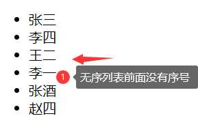 <ul> <!--无序列表--> <li>张三</li> <li>李四</li> <li>王二</li> <li>李一</li> <li>张酒</li> <li>赵四</li> </ul>