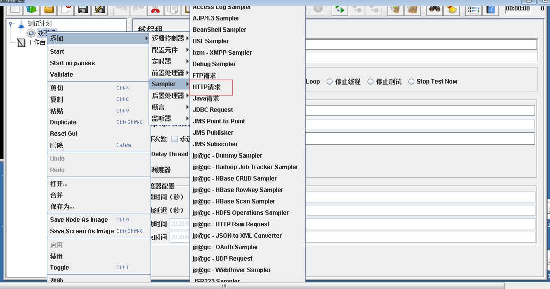 用来向服务器发送HTTP/HTTPS请求,鼠标右击线程组-》添加-》Sampler-》HTTP请求,如图: