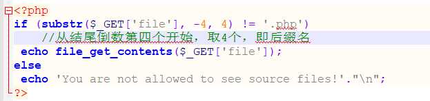 观察源码,源码当中取后四位即后缀名与.php比较,如果相同则输出不被允许查看源码的警告,若不同则读取文件内容。