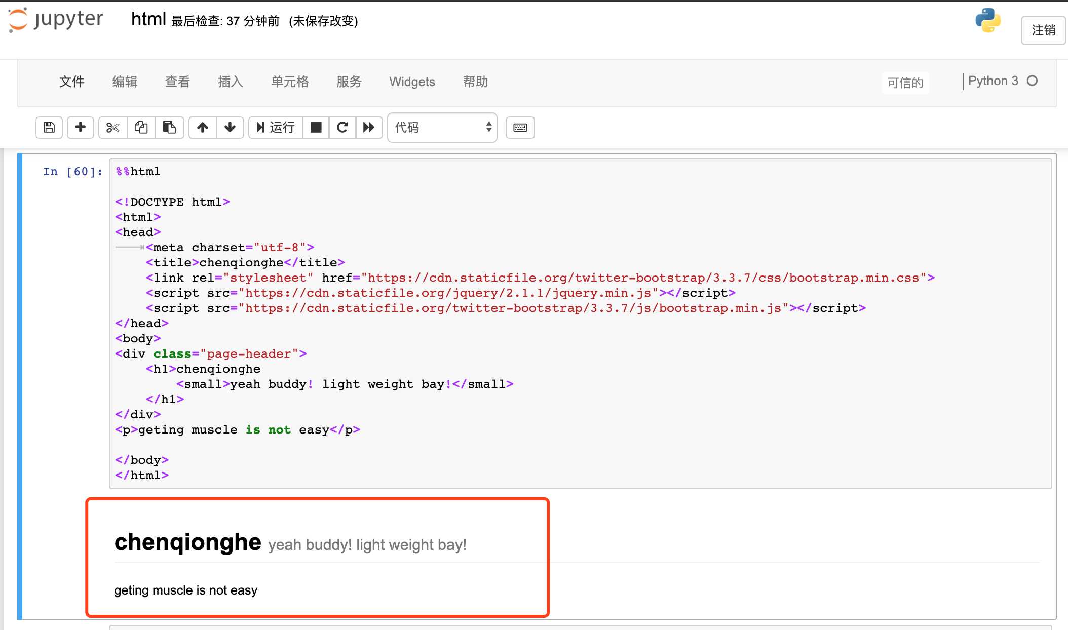 %%html<!DOCTYPE html><html><head> <meta charset="utf-8"> <title>chenqionghe</title> <link rel="stylesheet" href="https://cdn.staticfile.org/twitter-bootstrap/3.3.7/css/bootstrap.min.css"> <script src="https://cdn.staticfile.org/jquery/2.1.1/jquery.min.js"></script> <script src="https://cdn.staticfile.org/twitter-bootstrap/3.3.7/js/bootstrap.min.js"></script></head><body><div class="page-header"> <h1>chenqionghe <small>yeah buddy! light weight bay!</small> </h1></div><p>geting muscle is not easy</p></body></html>