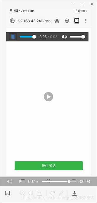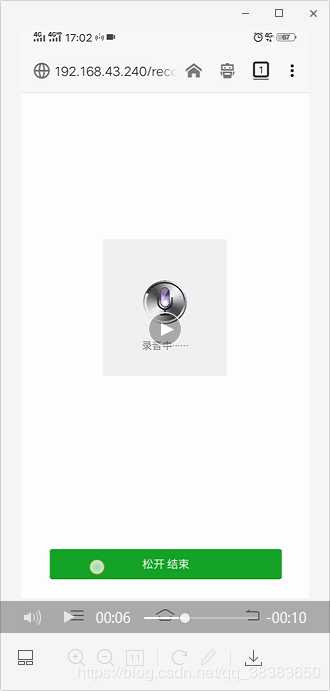 <script> var start = document.querySelector('#start'); var audio = document.querySelector('#audio'); var recorder = new Recorder({ sampleRate: 44100, //采样频率,默认为44100Hz(标准MP3采样率) bitRate: 128, //比特率,默认为128kbps(标准MP3质量) success: function(){ //成功回调函数 // start.disabled = false; }, error: function(msg){ //失败回调函数 console.log(msg); }, fix: function(msg){ //不支持H5录音回调函数 console.log(msg); } }); var mask = document.getElementById('mask'); var start = document.querySelector('#start'); start.addEventListener('touchstart',function(){ timer = setTimeout(function(){ for(var i = 0; i < audio.length; i++){ if(!audio[i].paused){ audio[i].pause(); } } start.innerHTML="松开结束" mask.style.display="block" recorder.start(); },500); }); start.addEventListener('touchmove',function(){ timeOutEvent = setTimeout(function(){ clearTimeout(timer); timer = 0; }); }) start.addEventListener("touchend", function (e) { console.log('touchend'); recorder.stop(); mask.style.display="none" recorder.getBlob(function(blob){ audio.src = URL.createObjectURL(blob); audio.controls = true; }); start.innerHTML="按住说话" clearTimeout(timer); return false; });</script>引入文件