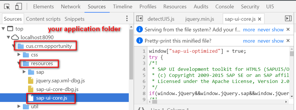 按F12打开development tool后,能够在Sources tab里看到这个sap-ui-core.js.