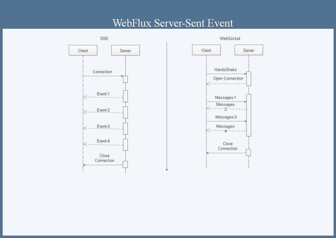 package com.example.webfluxserver;import lombok.extern.log4j.Log4j2;import org.springframework.boot.SpringApplication;import org.springframework.boot.autoconfigure.SpringBootApplication;import org.springframework.http.MediaType;import org.springframework.web.bind.annotation.GetMapping;import org.springframework.web.bind.annotation.RestController;import reactor.core.publisher.Flux;import java.time.Duration;@Log4j2@SpringBootApplicationpublic class WebfluxServerApplication extends BaseApplication{ public static void main(String[] args) { SpringApplication.run(WebfluxServerApplication.class, args); } @RestController class EmployeeController{ @GetMapping(value = "sse",produces = MediaType.TEXT_EVENT_STREAM_VALUE) public Flux<String> sse1(){ return Flux.interval(Duration.ofMillis(1000)).map(val ->val.toString()); } }}