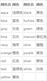 命名颜色的关键字有限,css定义了17个标准色:浅绿色,黑色,蓝色,紫红色,灰色,橙色,绿色,石灰,栗色,海军,橄榄,紫,红,银,蓝绿色,白色和黄色。