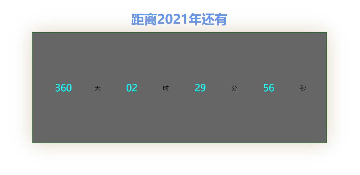 <script type="text/javascript"> var s1="2021-1-1,0:0:0"; window.onload=function(){ date(); function zero(i){ return i<10?"0"+i:i+""; } function date(){ var d=document.getElementById("day"); var h=document.getElementById("hour"); var m=document.getElementById("minute"); var s=document.getElementById("second"); var nowtime=new Date(); //var endtime=new Date("2020/1/5,00:00:00");//2020-1-1,0:0:0 var endtime=new Date(s1); var time=parseInt((endtime.getTime()-nowtime.getTime())/1000); var day=parseInt(time/(24*60*60)); var hour=parseInt(time/(60*60)%24); var minute=parseInt(time/60%60); var second=parseInt(time%60); day=zero(day); hour=zero(hour); minute=zero(minute); second=zero(second);//+零 d.innerHTML=day; h.innerHTML=hour; m.innerHTML=minute; s.innerHTML=second; setTimeout(date,1000); } } </script>
