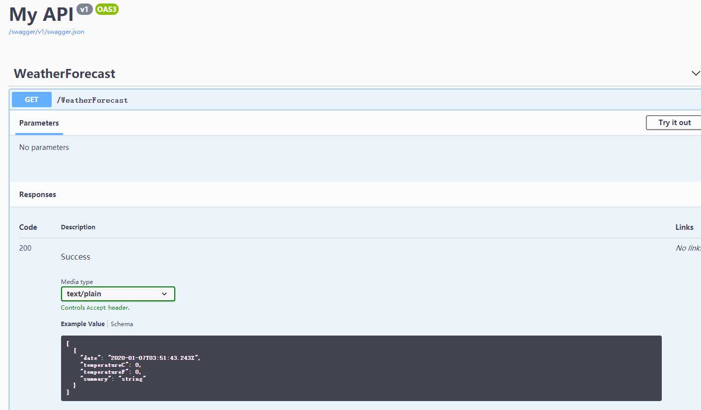 // Register the Swagger generator, defining 1 or more Swagger documents services.AddSwaggerGen(c => { c.SwaggerDoc("v1", new OpenApiInfo { Title = "My API", Version = "v1" }); });
