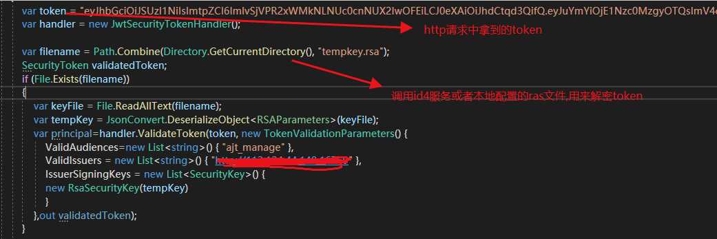 调用的是id4的文档配置,但是我为了减少不必要的远程调用,拿掉了id4的文档发现TokenPoint.改用在客户端直接配置ras文件,来给token解密,这里因为我用的是password模式,所有的系统都是高度信任的.所以可以这样做.而且微软也考虑到了这一点,代码如下: