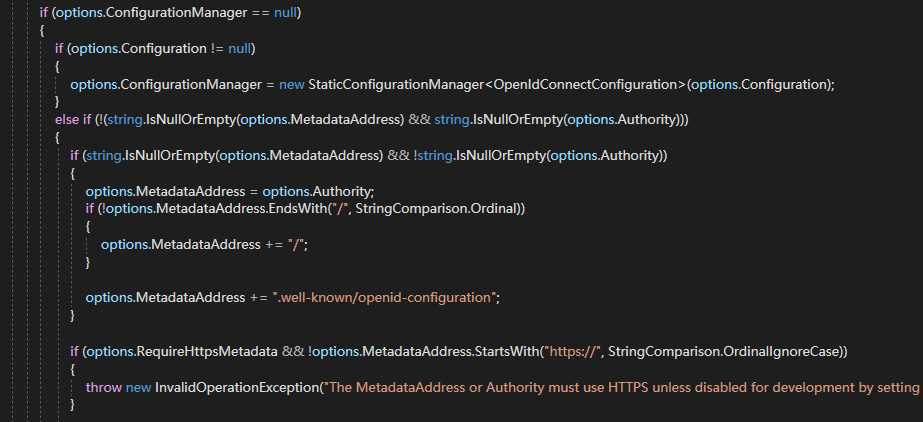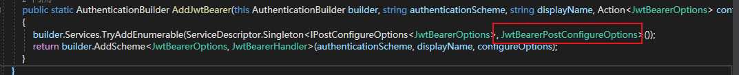 为啥要注入JwtBearerPostConfigureOptions这个配置对象呢?且这个配置对象是干嘛的呢?关于PostConfigureOpetions是.Net Core核心配置系统里面的一类对象,这类对象会在Options执行完毕之后执行,类似ABP模块加载系统的生命周期管理,执行完Init之后执行Post里面的方法,这里本质也是如此.ok,看看这个配置干了什么,源码如下:
