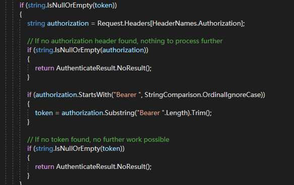 很简单,添加了方案名称为Bearer IdentityServerAuthenticationJwt的认证方案,且处理器为JwtBearerHandler,并指定参数.如果你已经掌握.Net Core的核心认证组件的流程,那么啥都不用说,直接看JwtBearerHandler干了什么,查看核心的认证方法HandleAuthenticateAsync,源码如下: