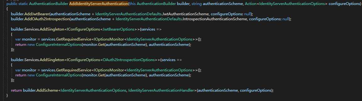 指定id4的认证方案,并指定认证参数,那么看看里面到底干了什么